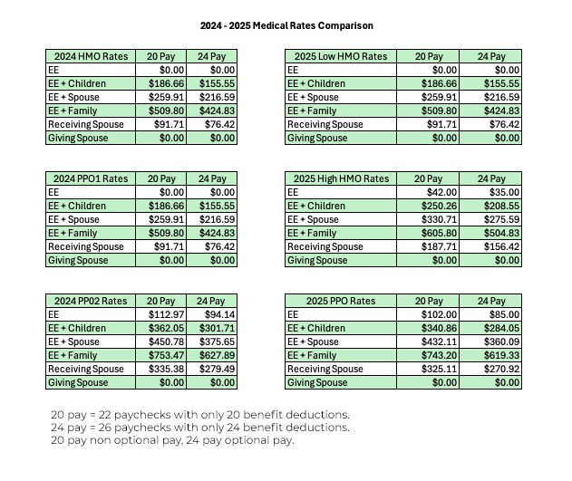 Important! Three new medical plans being offered in 2025. All previous plans will end 12/31/24. Mandatory enrollment for you and your dependents as plans, rates and coverages are changing. Two brand new HMO plans that offers an open access network! Be sure to select your primary care physician at the time of enrollment.